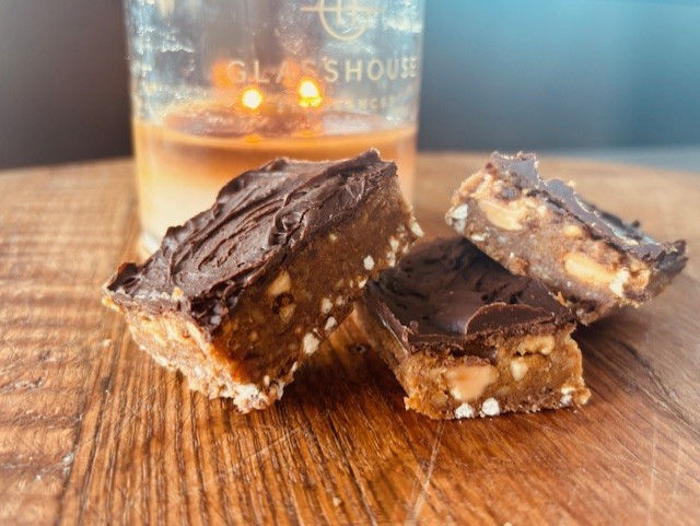 Pour the mixture onto the base, sprinkle the chopped peanuts evenly on top, and lightly press them into the slice with a spoon so they stay on the surface.